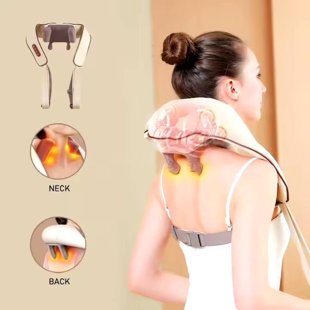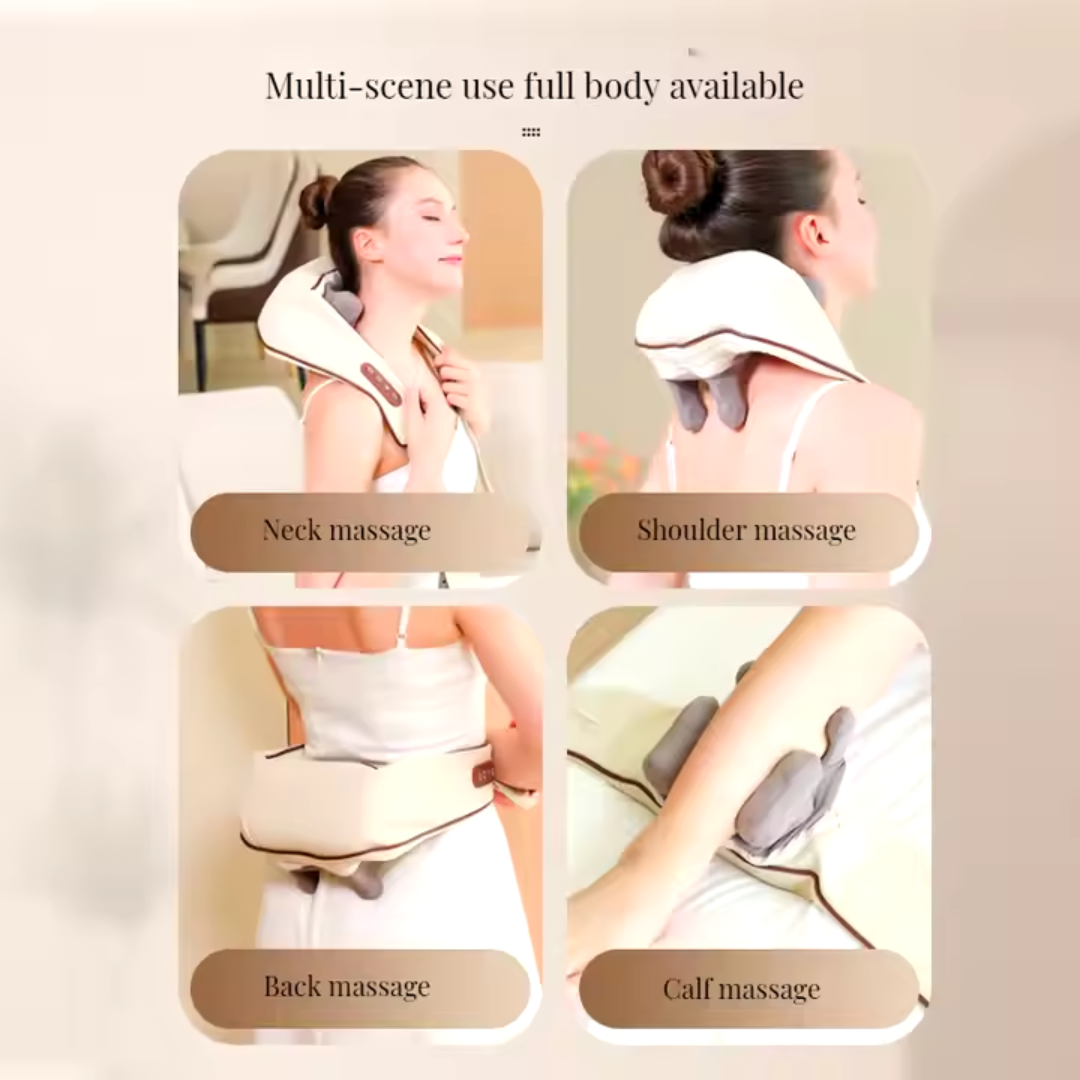Diseño ergonómico portátil, adaptable a cuello y hombros, ideal para usar en casa, en la oficina o en el coche.